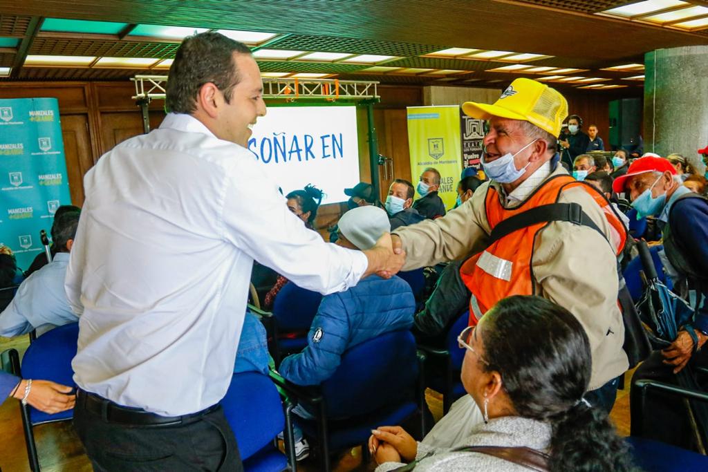 El alcalde de Manizales, Carlos Mario Marín Correa, se reúne con operarios de las zonas azules en el Teatro Los Fundadores. Allí les habla de la decisión de caducar el contrato del operador SUTEC, que fue adjudicado por la anterior administración.